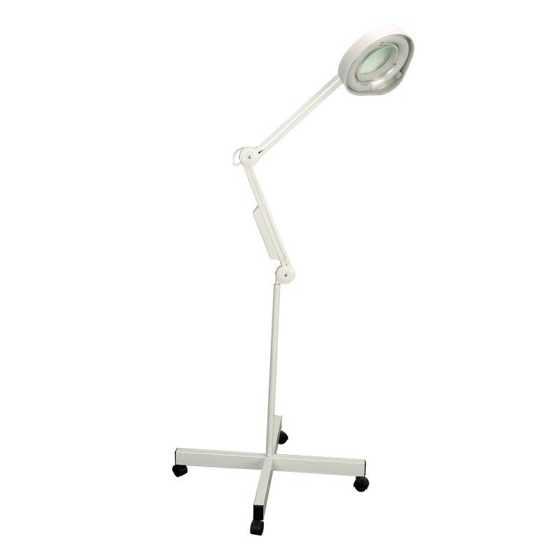 Lupa 5 dioptrias com lâmpada em um suporte de quatro pés.